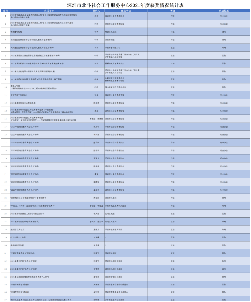 2021年1月1日至2021年12月31日,我机构及员工未受到任何单位的惩罚。 分类: 奖惩结果公示作者:北斗社工2022年6月30日 18:00文章导航上一页上一文章:北斗·服务速递 | 共创美好家园,你我都是“主角”下一页下一文章:北斗·服务速递 | 以简单的技能,提升生活的质量相关文章2025年度1月-6月深圳市北斗社会工作服务中心奖惩情况公示2025年7月2日 10:36关于2024年度深圳市社会工作者行业典范褒扬活动评选结果公示的通知2025年3月11日 19:362024年度深圳市北斗社会工作服务中心奖惩情况公示2025年1月14日 14:32关于开展我市社会工作行业自律自查工作的通知2024年12月5日 19:422023年度深圳市北斗社会工作服务中心奖惩情况公示2024年1月13日 15:282022年度深圳市北斗社会工作服务中心奖惩情况公示2023年1月10日 16:24