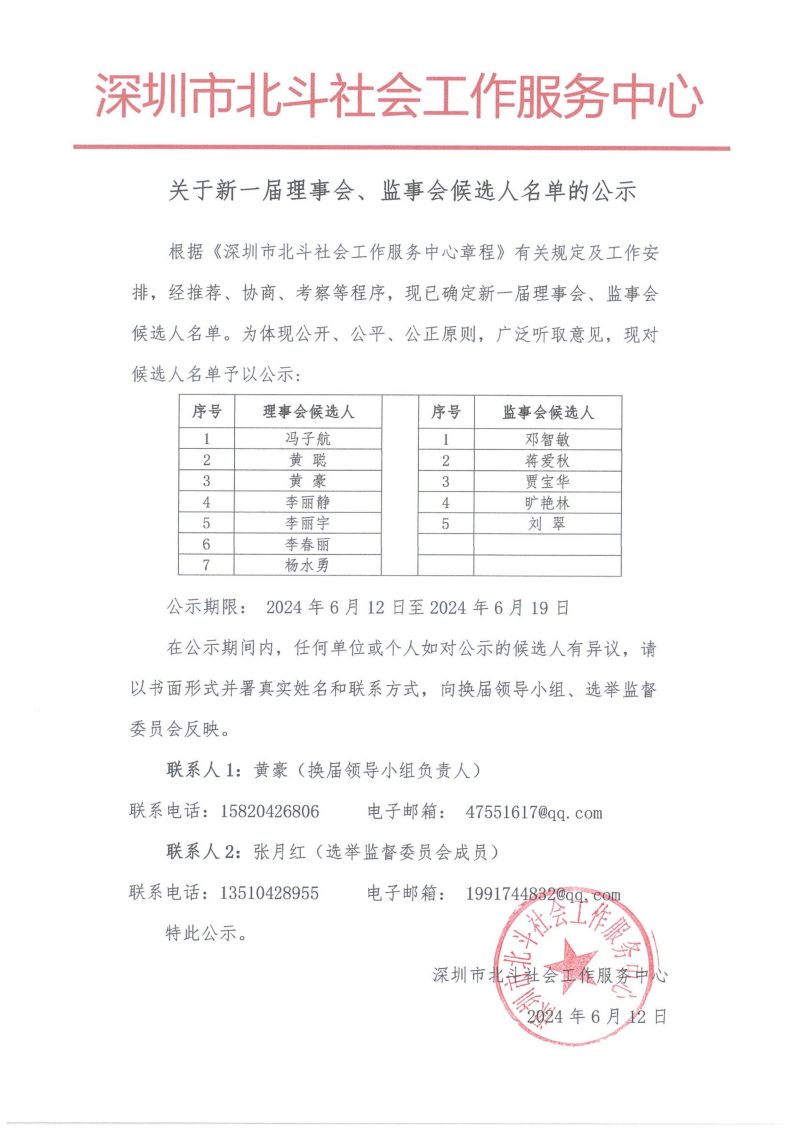 分类: 负责人任职公示作者:北斗社工2024年6月12日 09:35文章导航上一页上一文章:北斗·服务速递丨艾意浓浓 乐享端午—坭岗社区午节民俗体验活动下一页下一文章:深北斗〔2024〕18号 深圳市北斗社会工作服务中心第五届理事会、监事会成员候选人名单公示相关文章总干事任命通知2024年11月13日 09:00总干事任职前公示2024年11月8日 09:00第五届理事会领导班子任职公示2024年7月10日 18:00第五届理事会领导班子任职前公示2024年7月8日 16:30第五届理事会选举结果公示2024年7月8日 16:29关于换届工作领导小组、选举监督委员会的公示2023年12月9日 15:49
