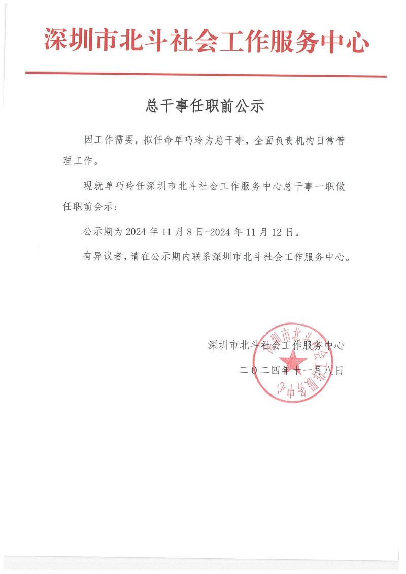 分类: 信息公开, 负责人任职公示作者:北斗社工2024年11月8日 09:00文章导航上一页上一文章:铜鼓社区党群服务中心2024年第3季度经费使用明细表下一页下一文章:北斗党建 | 2024年11月第一议题、“三会一课”和主题党日内容指引相关文章深圳市北斗社会工作服务中心2025年1月-7月政府购买服务情况统计2025年8月10日 09:23市委政法委政府职工帮扶、纠纷调解领域(5个)2025年第2季度经费使用明细表2025年7月18日 10:122025年度1月-6月深圳市北斗社会工作服务中心奖惩情况公示2025年7月2日 10:36关于深圳市北斗社会工作服务中心2025年上半年与利益相关方是否有交易情况的声明2025年6月30日 18:58关于深圳市北斗社会工作服务中心2025年上半年是否被认定为慈善组织的声明2025年6月30日 18:54关于深圳市北斗社会工作服务中心2025年上半年服务收费的声明2025年6月30日 16:00