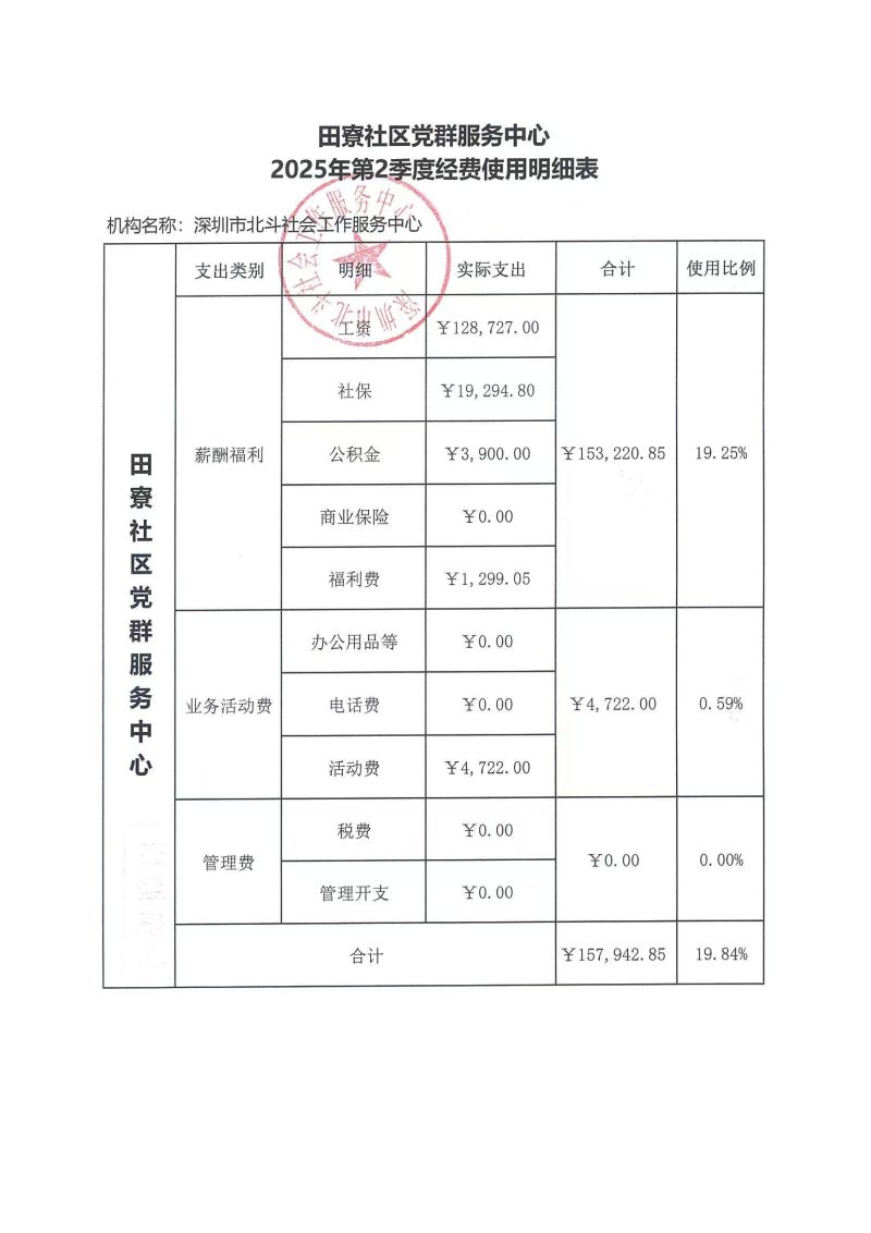 田寮社区党群服务中心2025年第2季度经费使用明细表