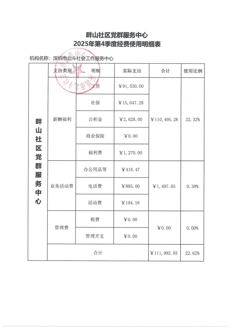 畔山社区党群服务中心2025年第4季度经费使用明细表