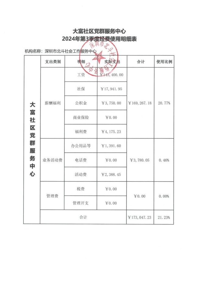 大富社区党群服务中心2024年第3季度经费使用明细表