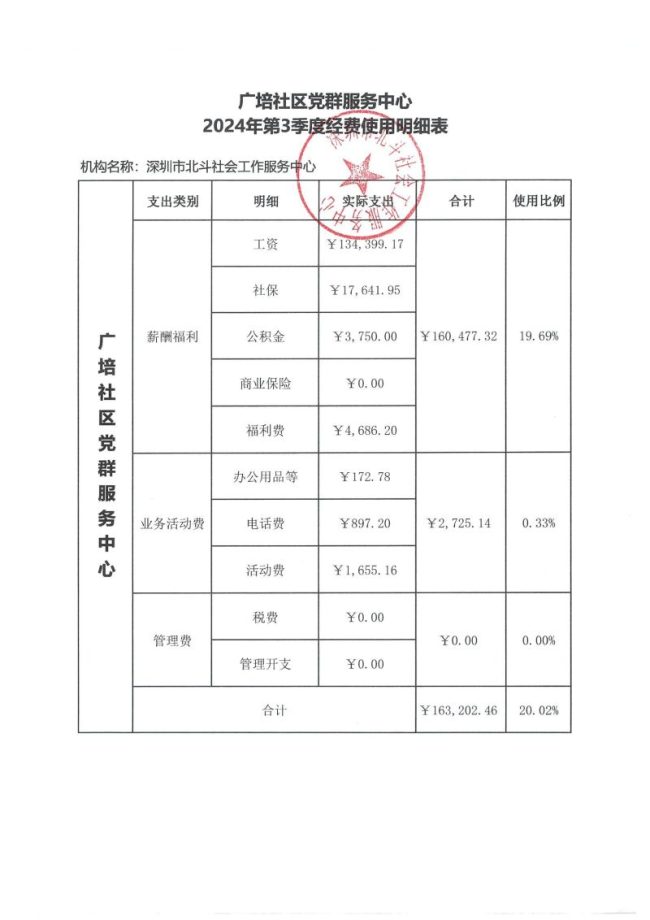 后海社区党群服务中心2024年第3季度经费使用明细表