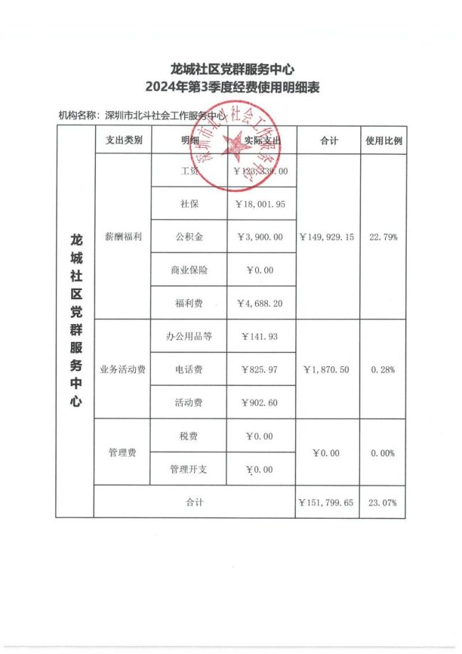 龙城社区党群服务中心2024年第3季度经费使用明细表