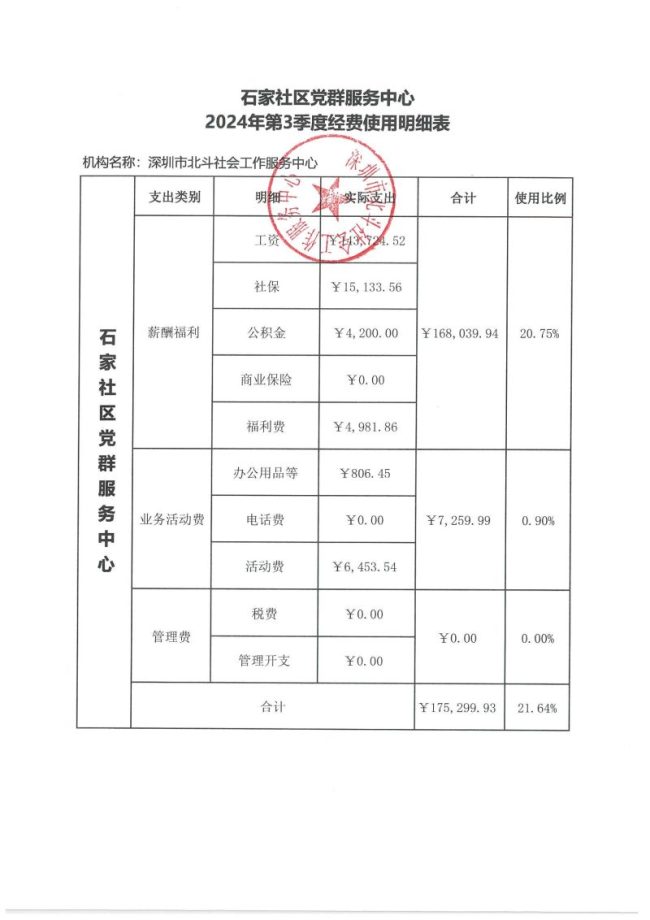 石家社区党群服务中心2024年第3季度经费使用明细表