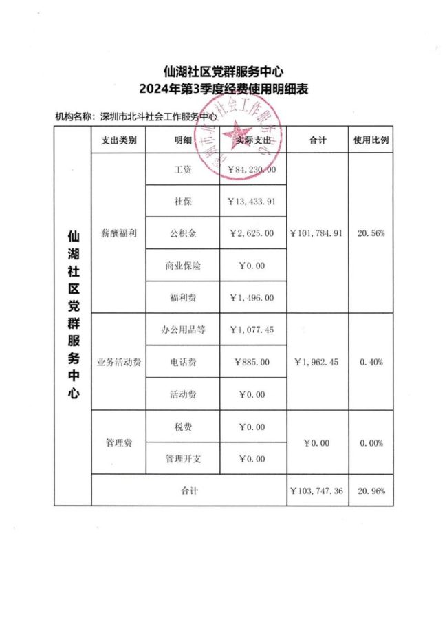 仙湖社区党群服务中心2024年第3季度经费使用明细表