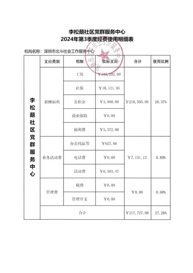 李松蓢社区党群服务中心2024年第3季度经费使用明细表