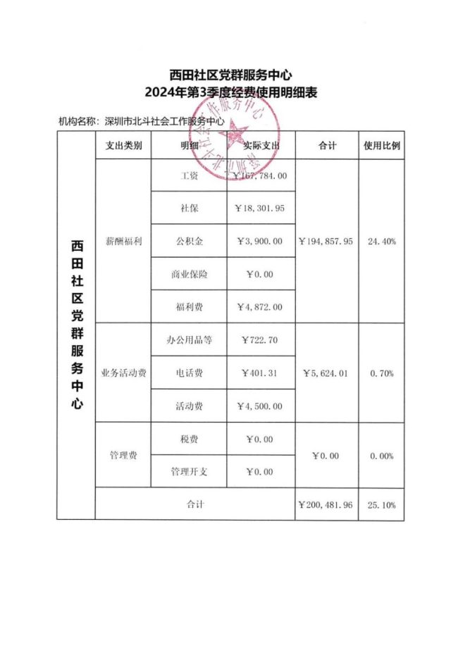 西田社区党群服务中心2024年第3季度经费使用明细表