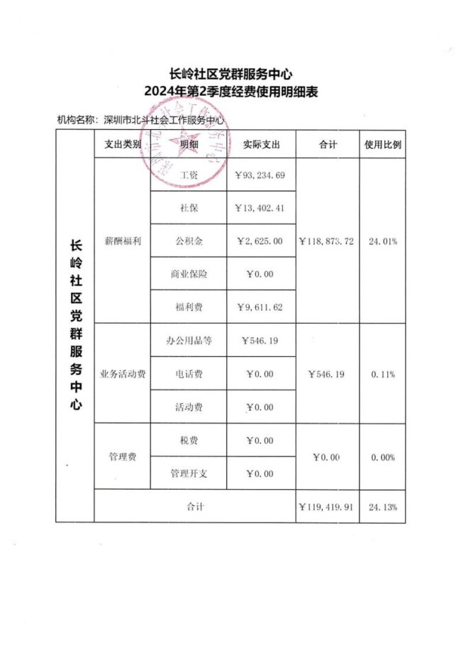 长岭社区党群服务中心2024年第2季度经费使用明细表