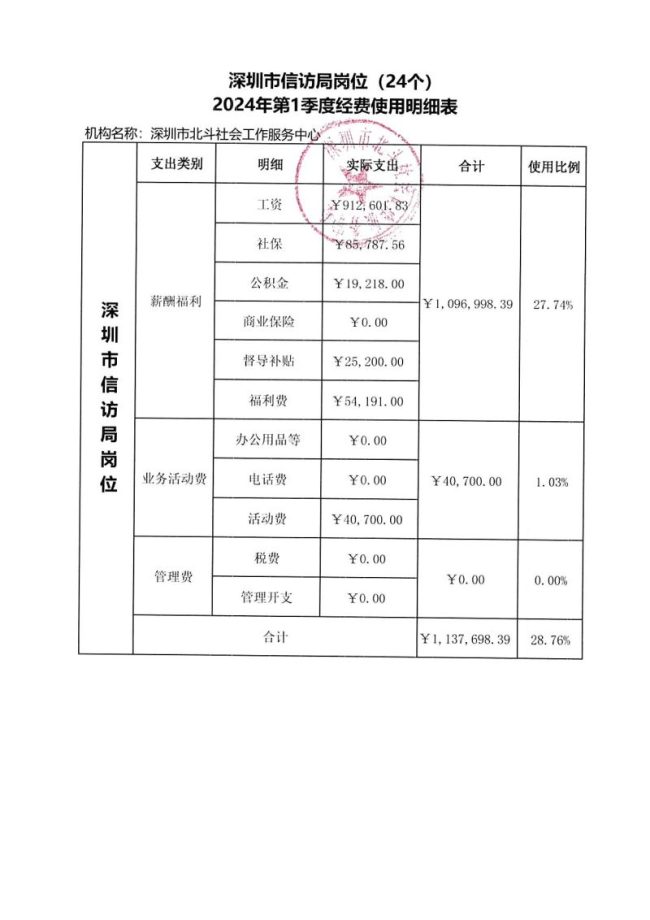 深圳市信访局岗位(24个)2024年第1季度经费使用明细表