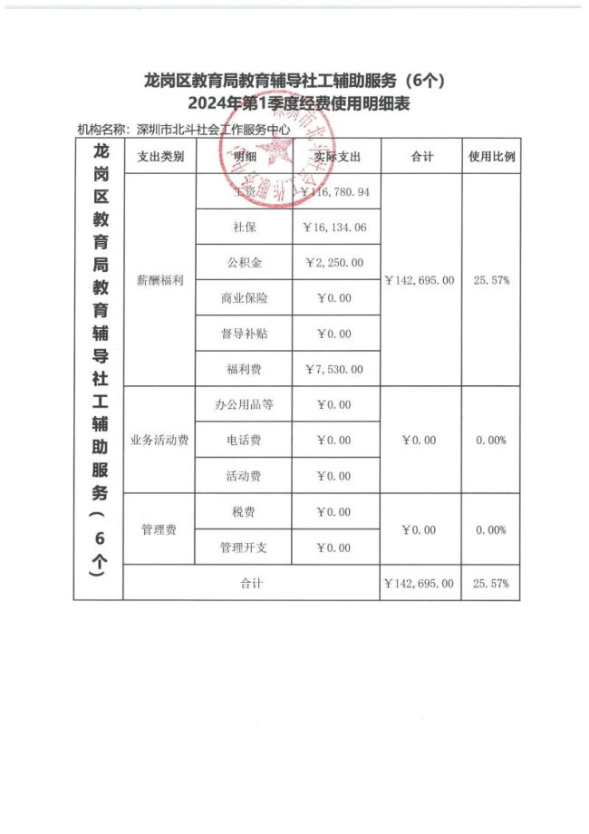 龙岗区教育局教育辅导社工辅助服务(6个)2024年第1季度经费使用明细表