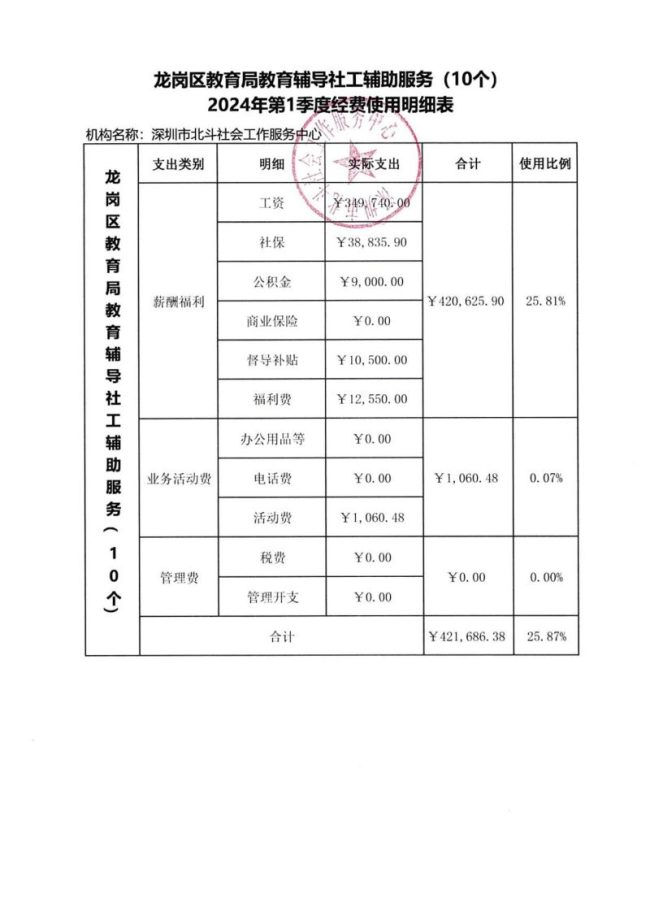 龙岗区教育局教育辅导社工辅助服务(10个)2024年第1季度经费使用明细表
