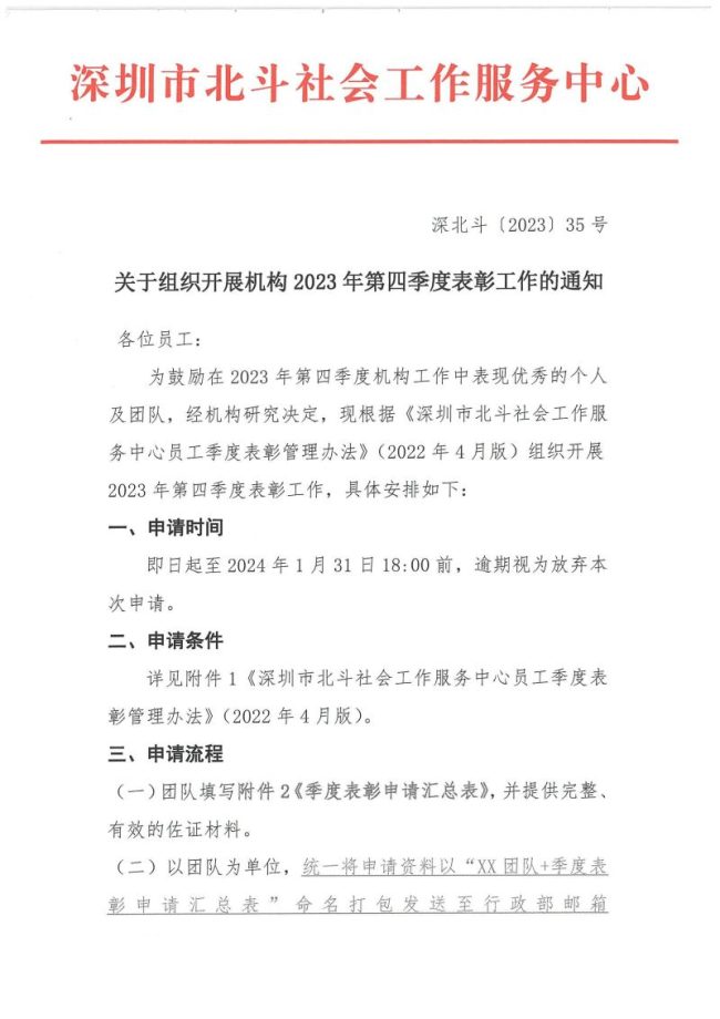 深北斗〔2023〕35号 关于组织开展机构2023年第四季度表彰工作的通知
