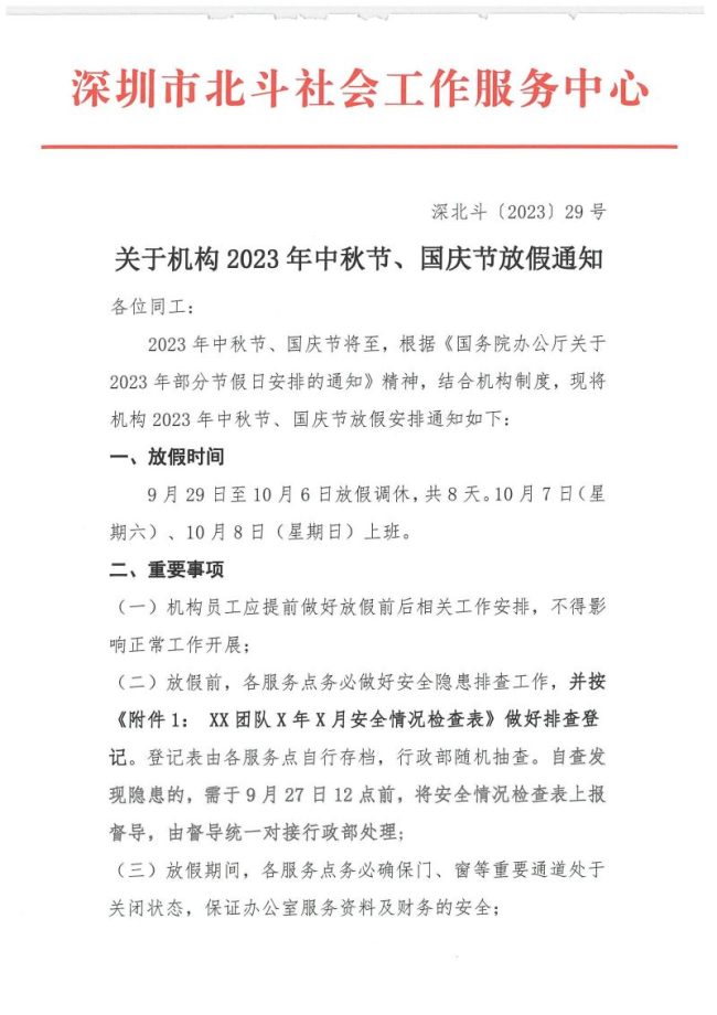 深北斗〔2023〕29号关于机构2023年中秋节、国庆节放假通知