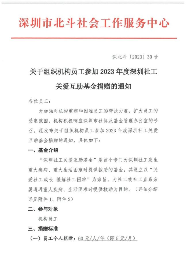 深北斗〔2023〕30号 关于组织机构员工参加2023年度深圳社工关爱互助基金捐赠的通知