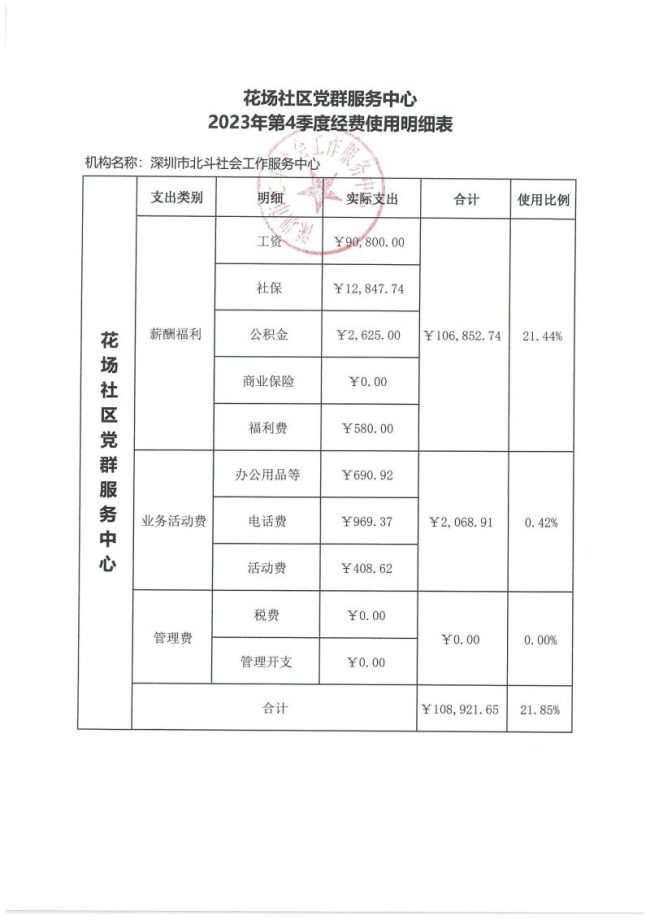 北站社区党群服务中心2023年第四季度财务公示