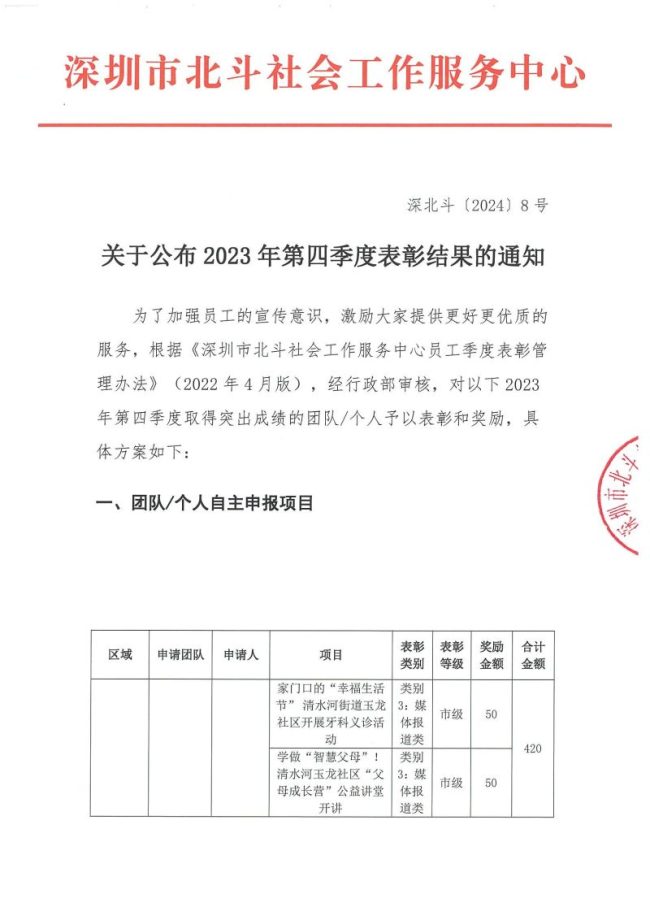 深北斗〔2024〕8号 关于公布2023年第四季度表彰结果的通知(公示) 通知公告作者:北斗社工2024年3月25日 17:45详情请查看附件: 深北斗〔2024〕8号 关于公布2023年第四季度表彰结果的通知(公示)