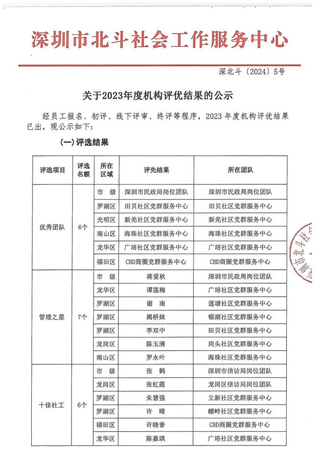 深北斗〔2024〕5号关于2023年度机构评优结果的公示