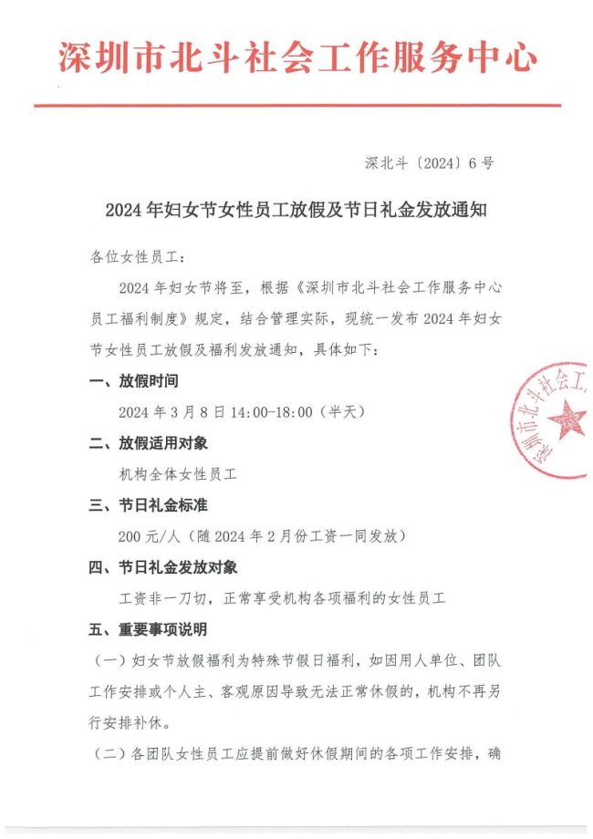 深北斗〔2024〕6号 2024年妇女节女性员工放假及节日礼金发放通知