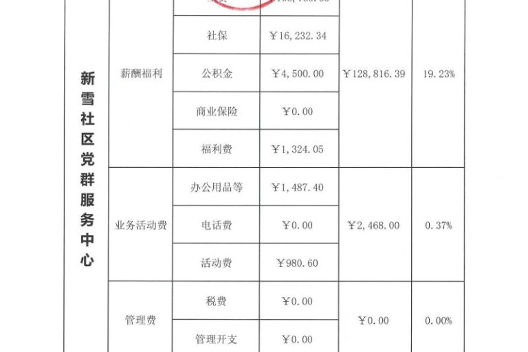 新雪社区党群服务中心2024年第2季度经费使用明细表