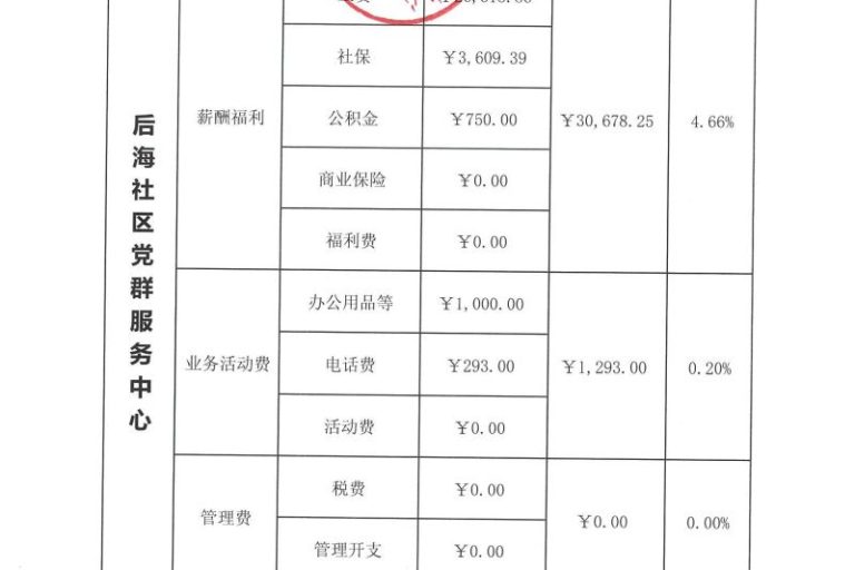 后海社区党群服务中心2024年第2季度经费使用明细表